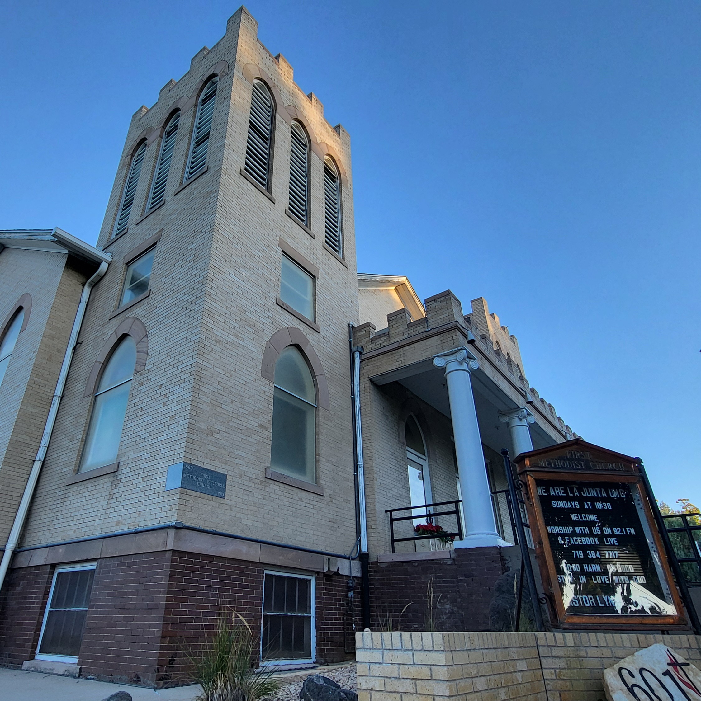 The current United Methodist Church of La Junta began its Gothic Revival style construction in 1913 and is located in a residential neighborhood at the intersection of San Juan Avenue and 6th Street. At the time of construction, the church was known as the First Methodist Episcopal Church.