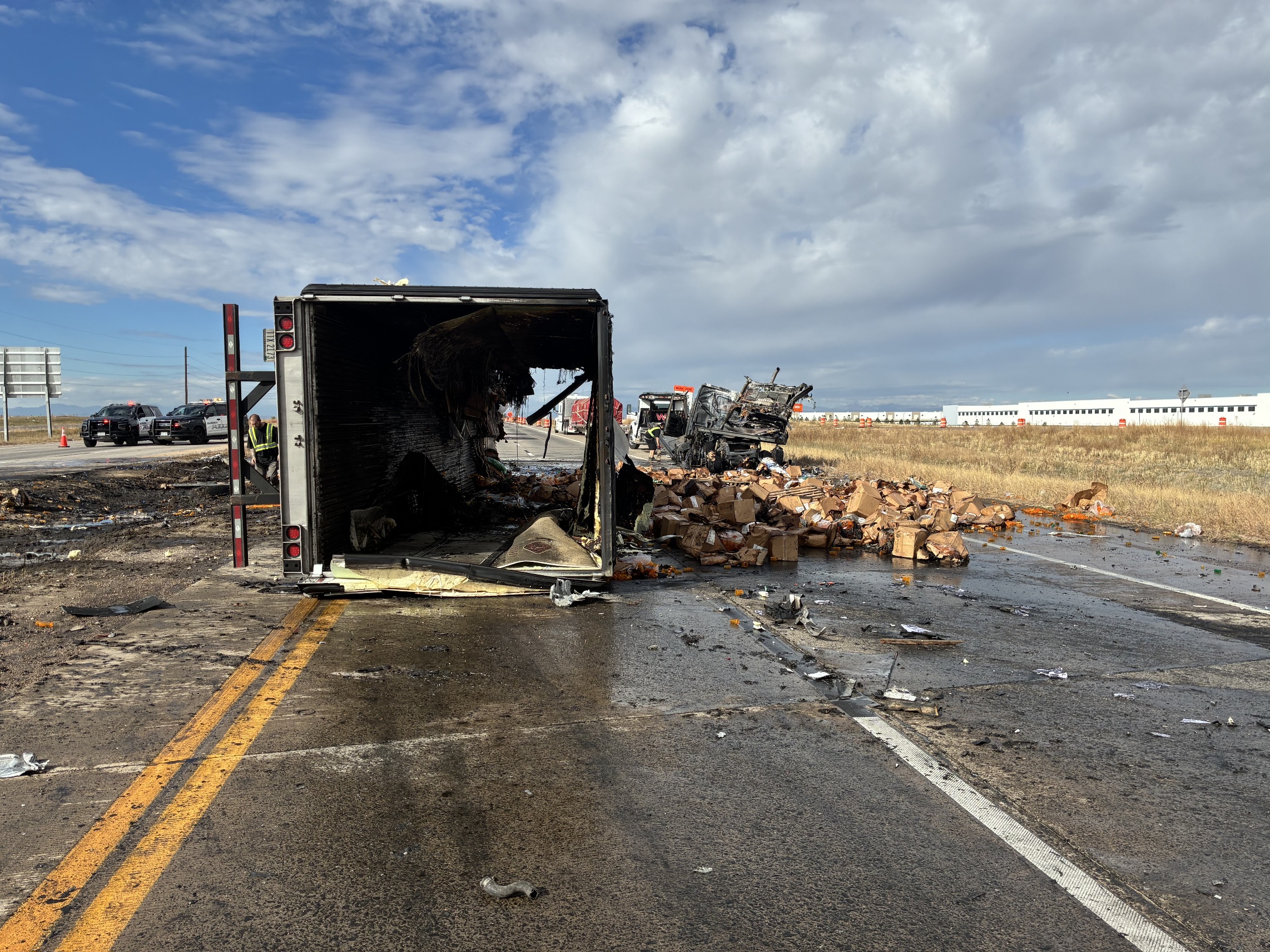 Description: Two semi-trucks crashed on I-70 near E-470 in Adams County, Colorado, causing one to erupt in flames and shutting down the interstate. Eastbound lanes and one westbound lane have reopened as crews continue cleanup.