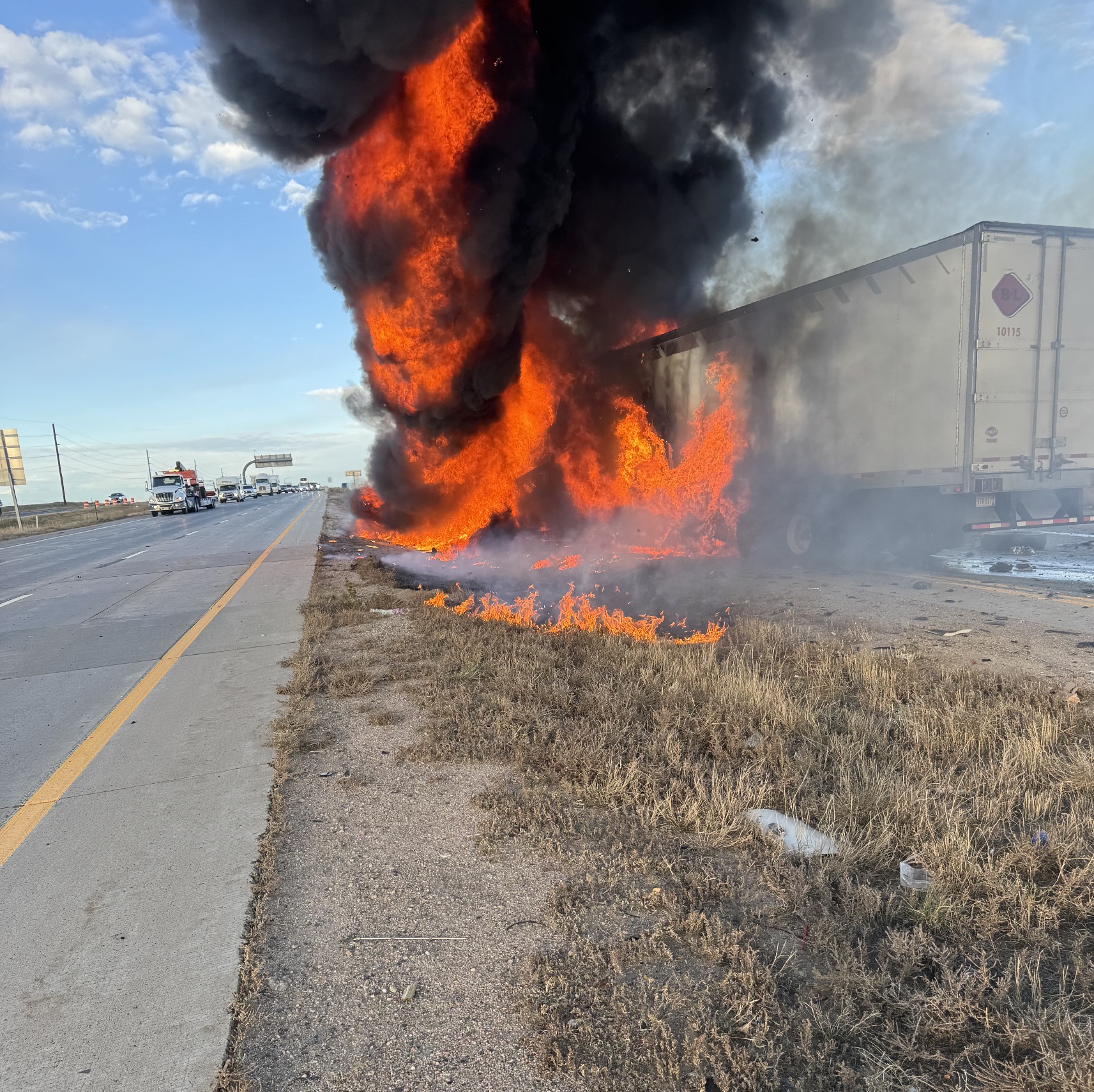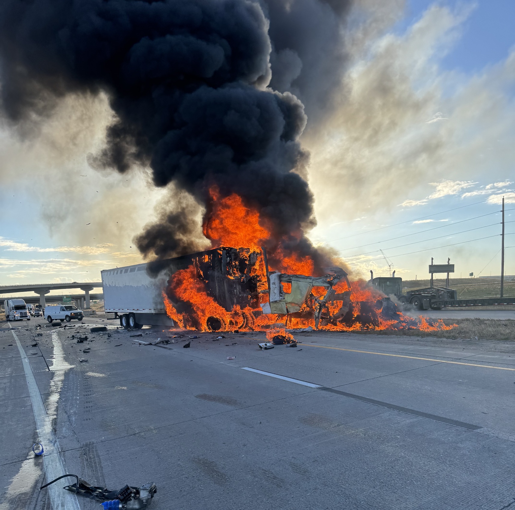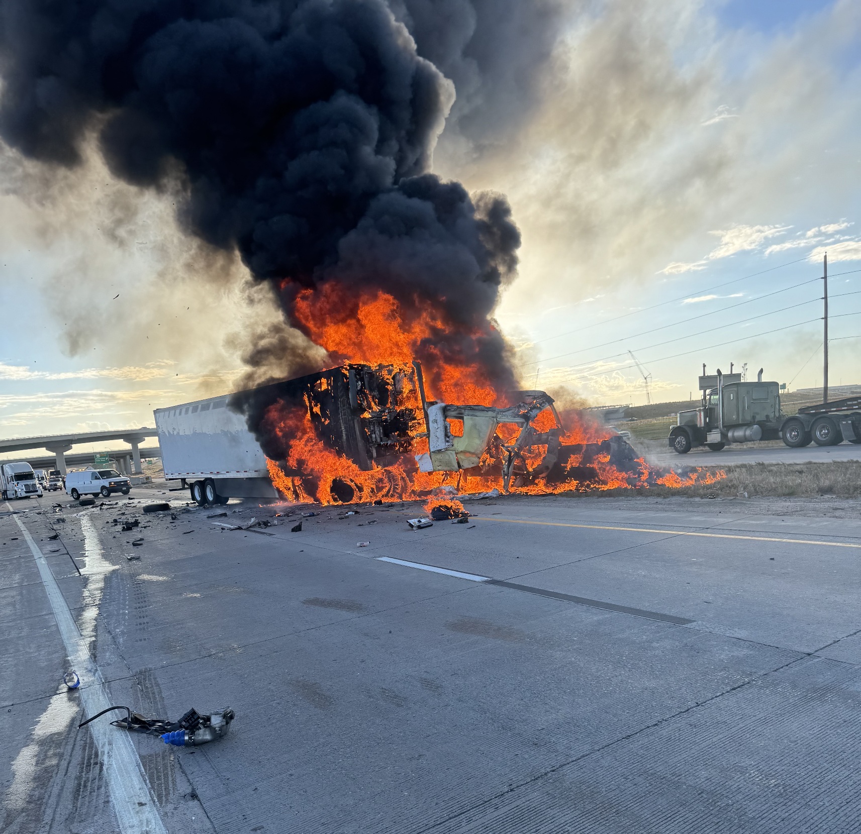 (Adams County, Colorado) - Earlier this morning at approximately 8:26 a.m., the Colorado State Patrol responded to a crash involving two semi trucks on Interstate 70 near milepost 289, west of E-470. One of the tractor-trailers became fully engulfed in flames, shutting down traffic in both directions of I-70. All eastbound lanes and one westbound lane have been reopened.