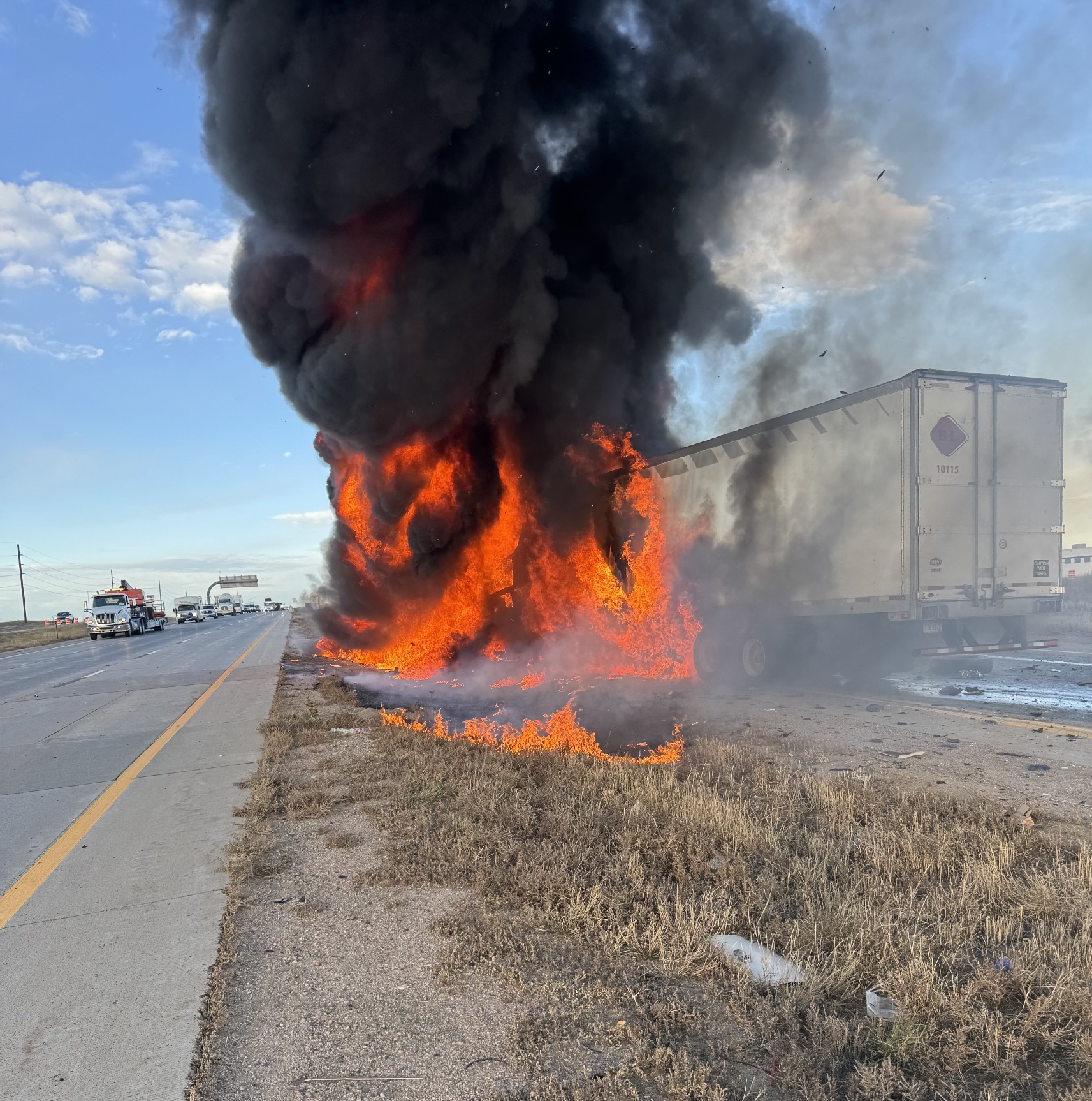 Initial reports indicate that the Volvo rear-ended the trailer being hauled by the Peterbilt, with the Volvo and trailer coming to rest in the median. This caused the Volvo and its trailer to become fully engulfed in flames. The trailer then tipped over onto its side into the left lane of westbound Interstate 70. The trailer was carrying plastic cargo, which spilled onto the roadway, spreading the fire onto the roadway and the grassy median.