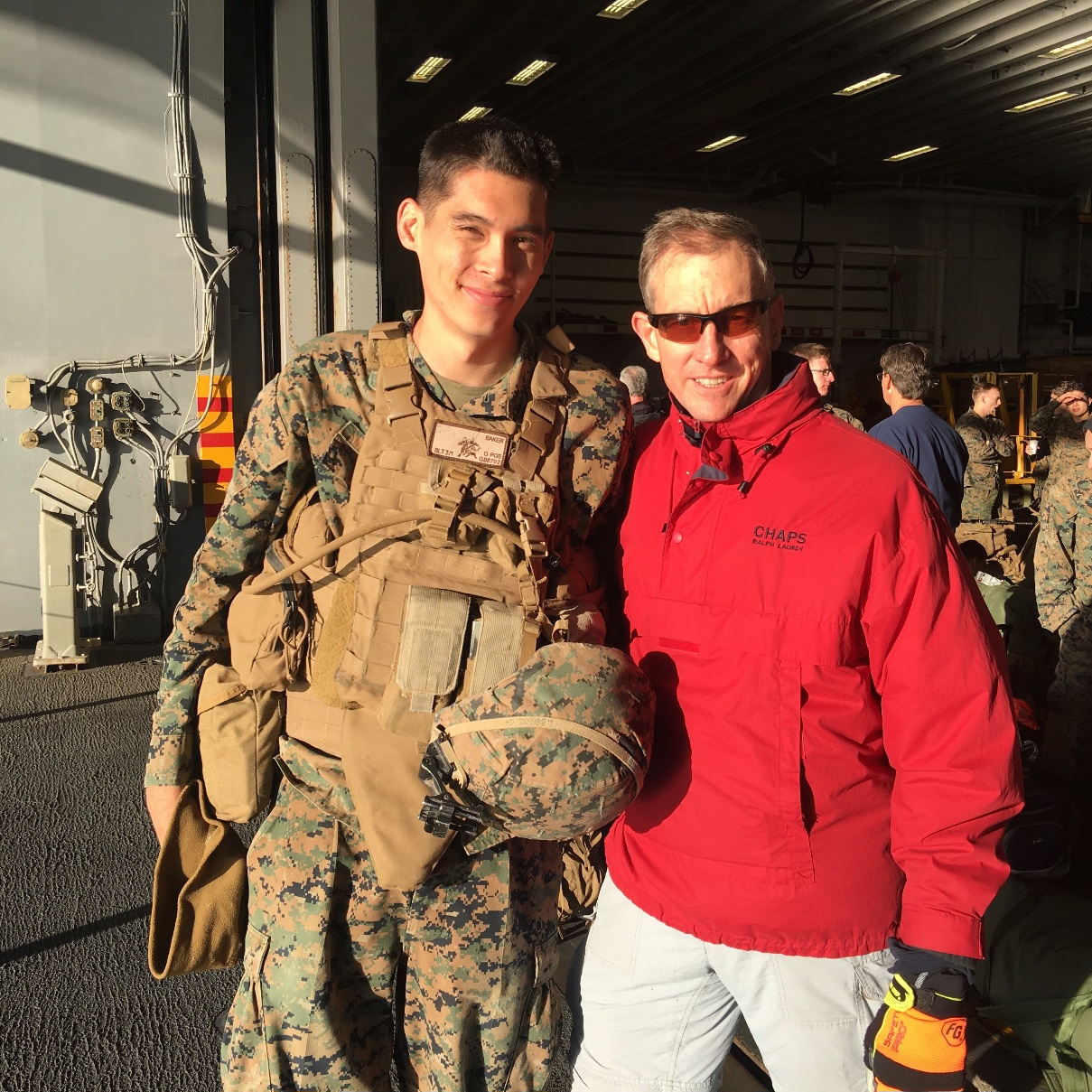 Chris Baker’s son, a US Marine, and Chris on the USS ESSEX.