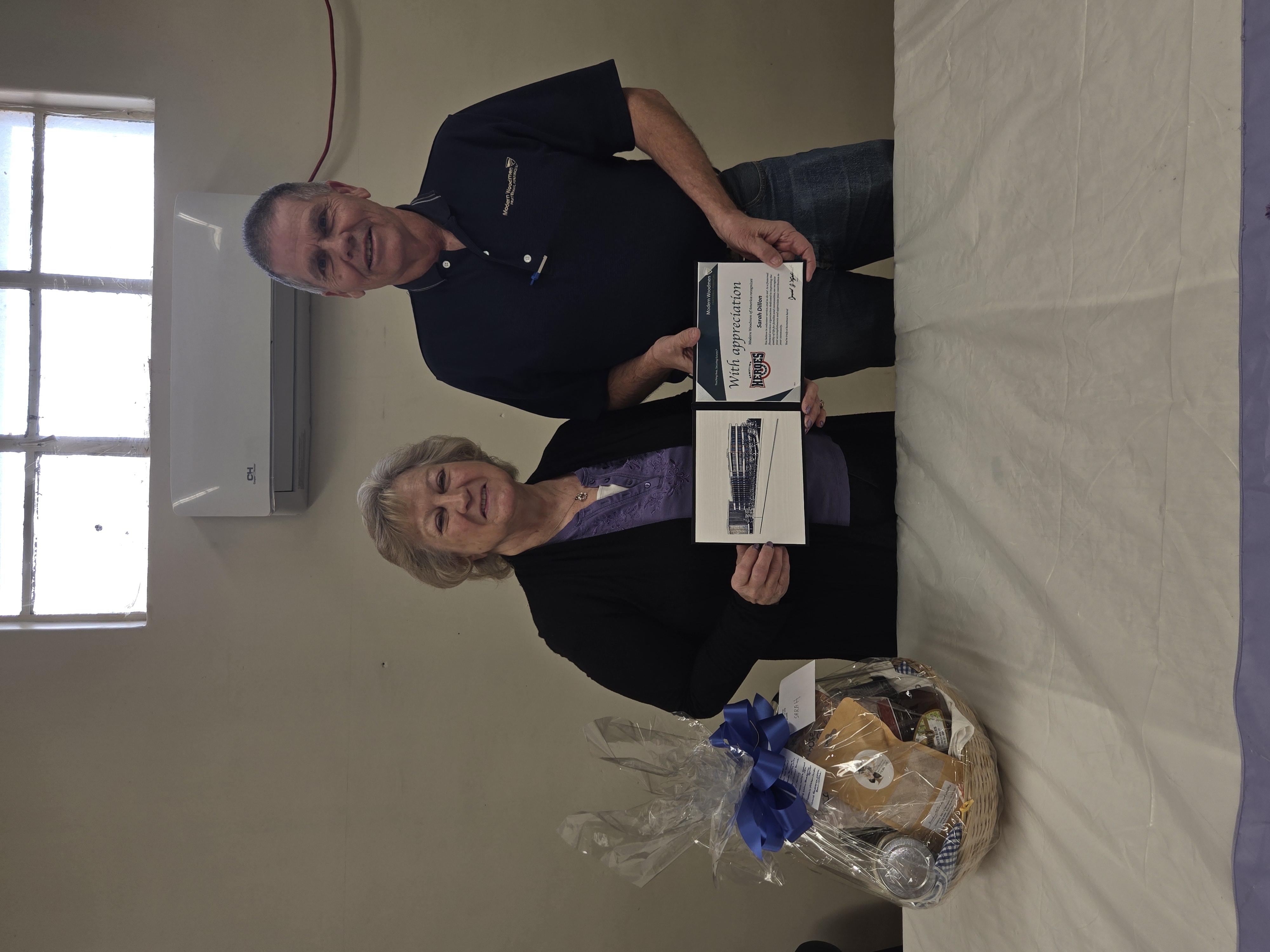 The plaque states: “With appreciation, Modern Woodmen of America recognizes Sarah Dillon. You believe in volunteer service, and so do we! As a fraternal financial service organization dedicated to improving the quality of life for families and communities, we recognize your accomplishments and appreciate your contribution to your community. You’re truly a “Hometown Hero!”
