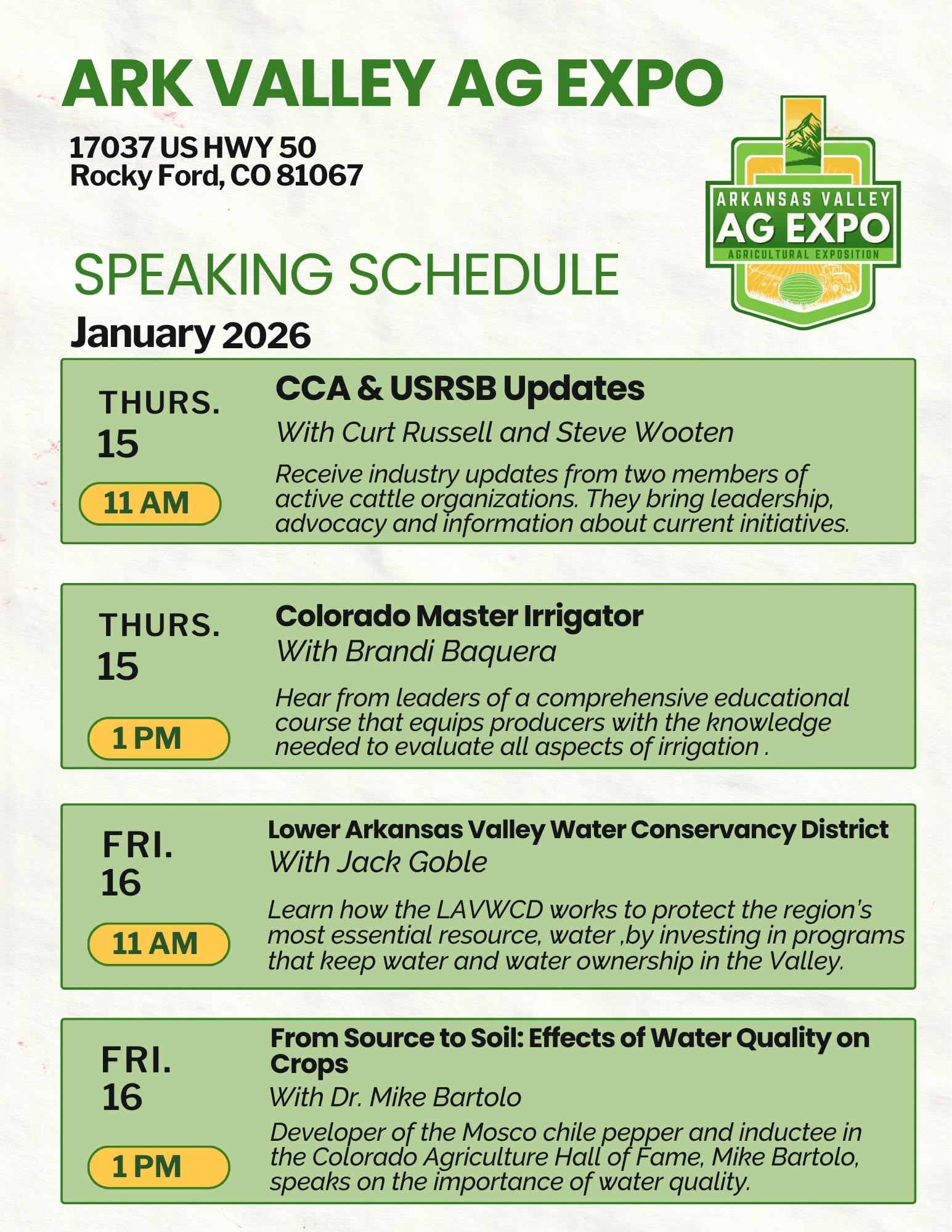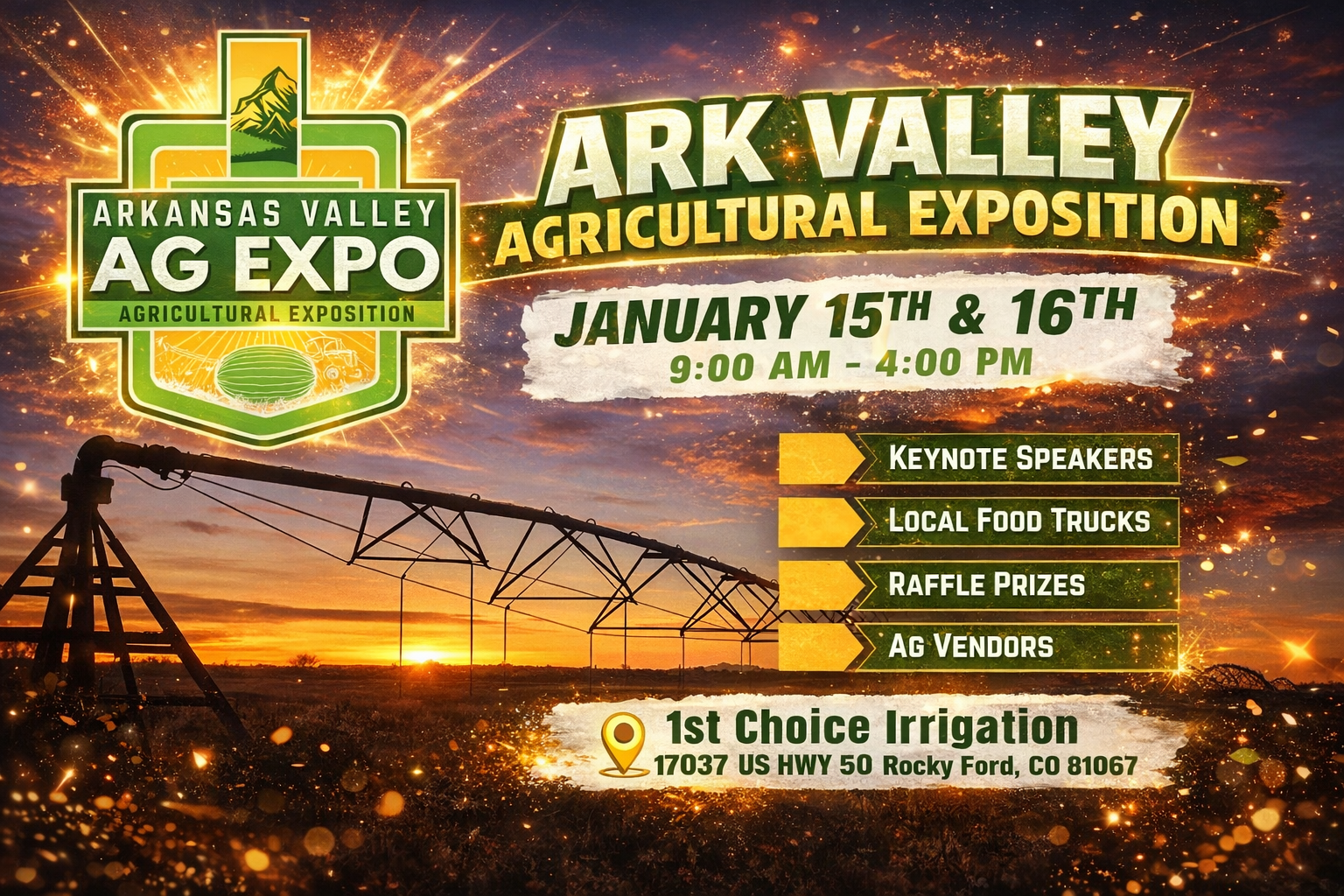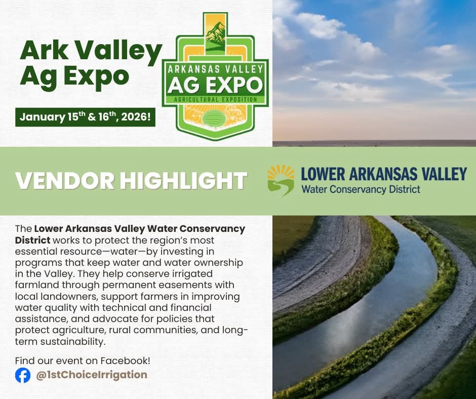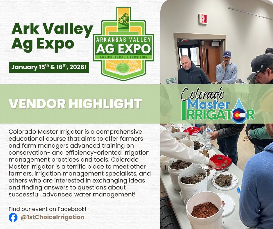 Description: Join the People of Southeast Colorado as 1st Choice Irrigation Hosts the 2nd Annual Arkansas Valley Ag Expo on January 15 & 16 from 9:00AM - 4:00PM in Rocky Ford Colorado...