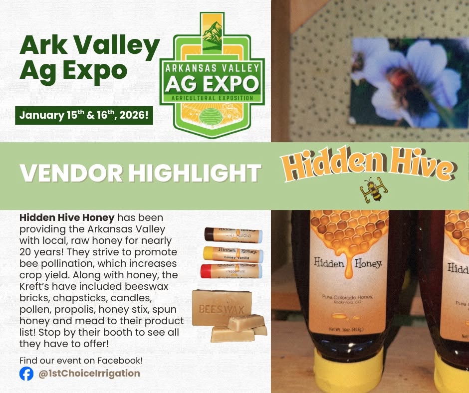 Hidden Hive Honey has been providing the Arkansas Valley with local, raw honey for nearly 20 years! They strive to promote bee pollination, which increases crop yield. Along with honey, the Kreft's have included beeswax bricks, chapsticks, candles, pollen, propolis, honey stix, spun honey and mead to their product list! Stop by their booth to see all they have to offer!