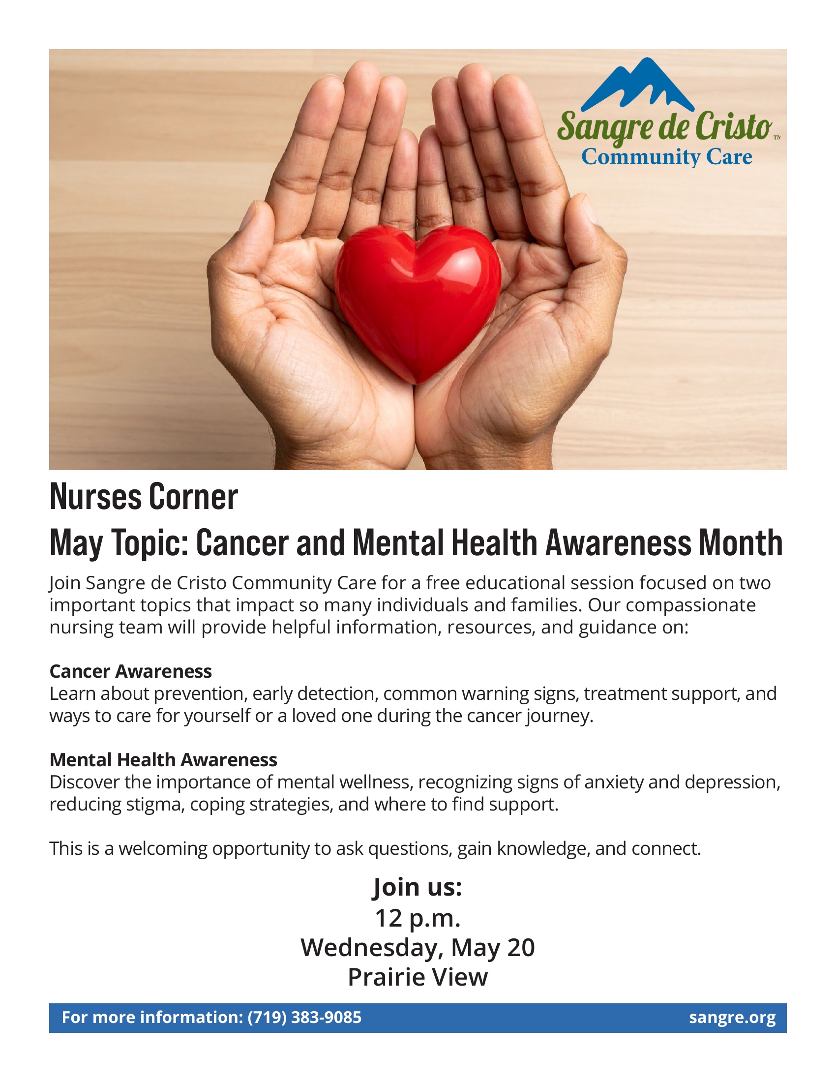 Description: Join Sangre de Cristo Community Care for a free Nurses Corner session on cancer and mental health awareness at Prairie View, 12 p.m. May 20.