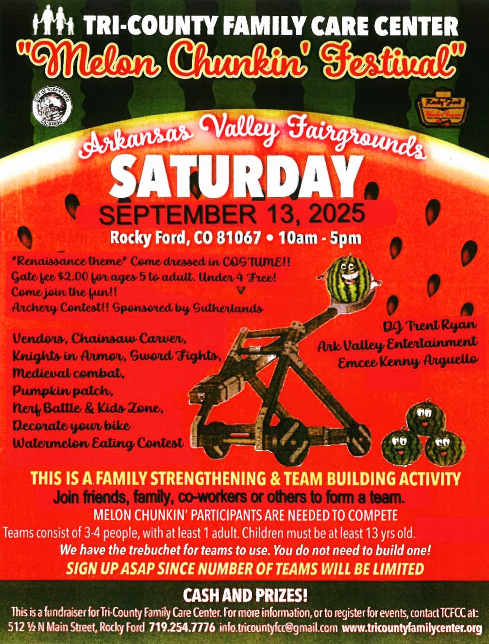 Tri-County Family Care Center Melon Chunkin' Festival - Sept. 13th Tri-County Family Care Center will have a Melon Chunkin’ Festival on Saturday, September 13th , 2025, at the Arkansas Valley Fairgrounds from 10:00 am to 5:00 pm. Kenny Argue...