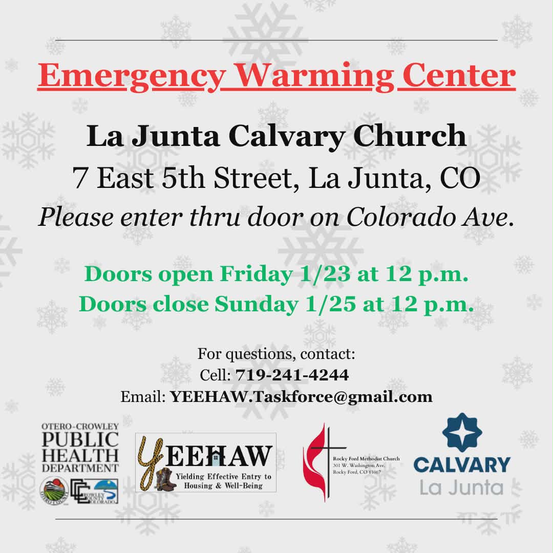 Emergency Warming Center at La Junta Calvary Church 7 East 5th Street, La Junta, CO Please enter thru door on Colorado Ave. Doors open Friday 1/23 at 12 p.m. Doors close Sunday 1/25 at 12 p.m. For questions, contact: Cell: 719-241-4244 Email: YEEH...