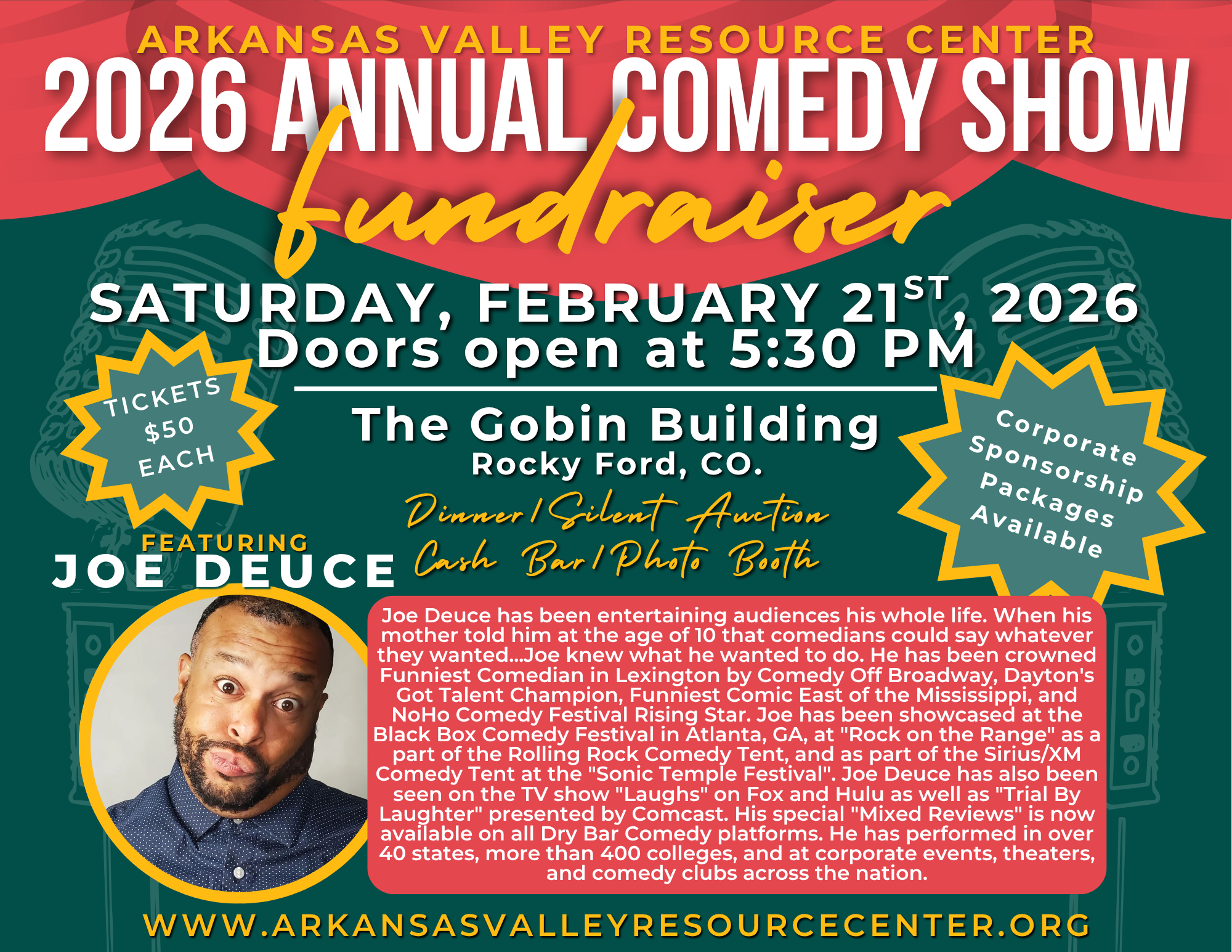 ARKANSAS VALLEY RESOURCE CENTER 2026 ANNUAL COMEDY SHOW FUNDRAISER! FEATURING JOE DEUCE! SATURDAY, FEBRUARY 21ST, 2026 Doors open at 5:30 PM The Gobin Building Rocky Ford, CO. TICKETS $50 EACH Dinner / Silent Auction Cash Bar Photo Booth Corporate...
