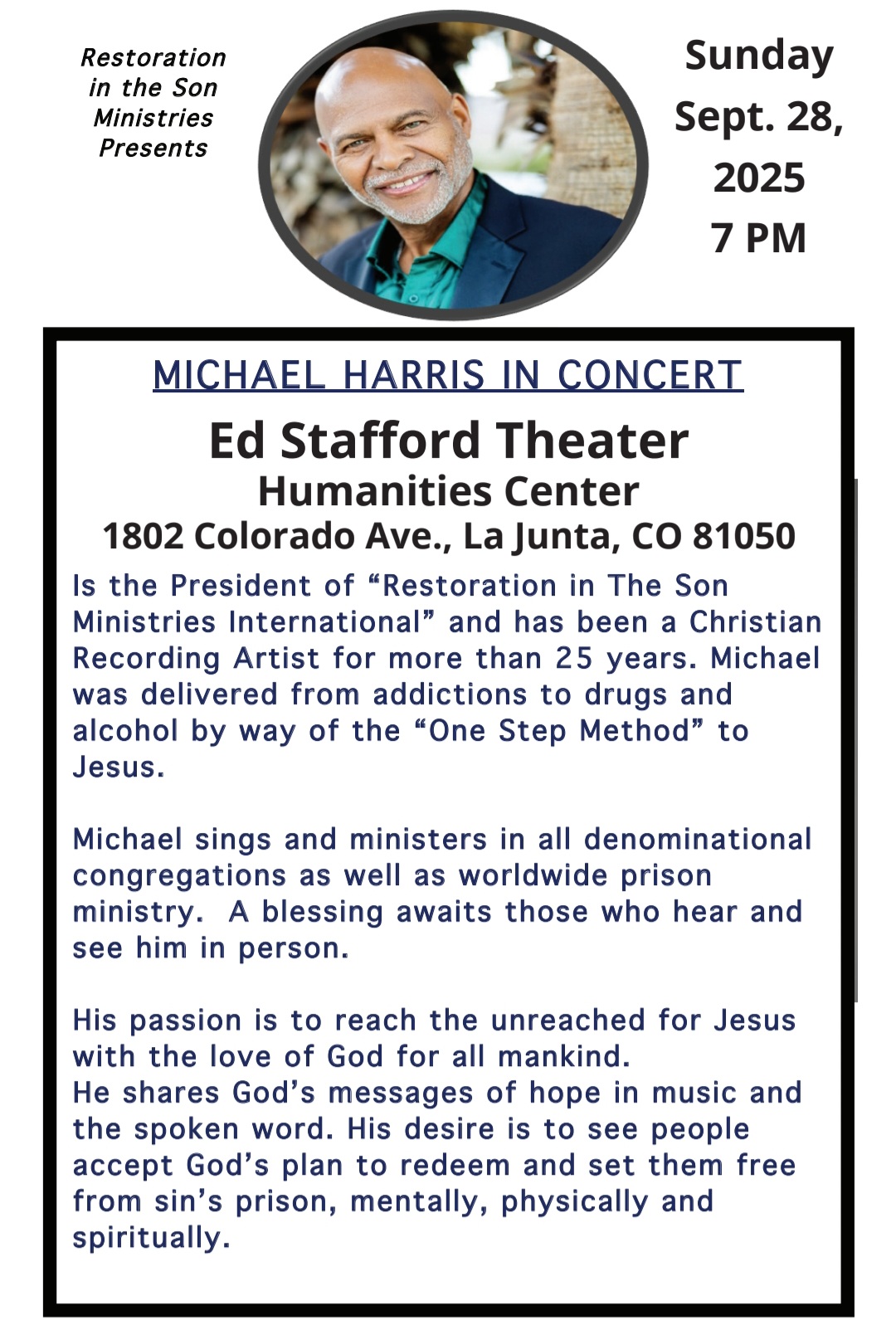 Restoration in the Son Ministries Presents: Sunday, Sept. 28, 2025 at 7 PM MICHAEL HARRIS IN CONCERT Ed Stafford Theater Humanities Center 1802 Colorado Ave., La Junta, CO 81050 Is the President of "Restoration in The Son Ministries International"...
