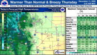 Today Sunny, with a high near 69. West wind 10 to 15 mph. Tonight Mostly clear, with a low around 27. West wind around 5 mph. Friday Sunny, with a high near 57. North wind 5 to 15 mph becoming south southeast in the afternoon. Friday Night Mostly ...
